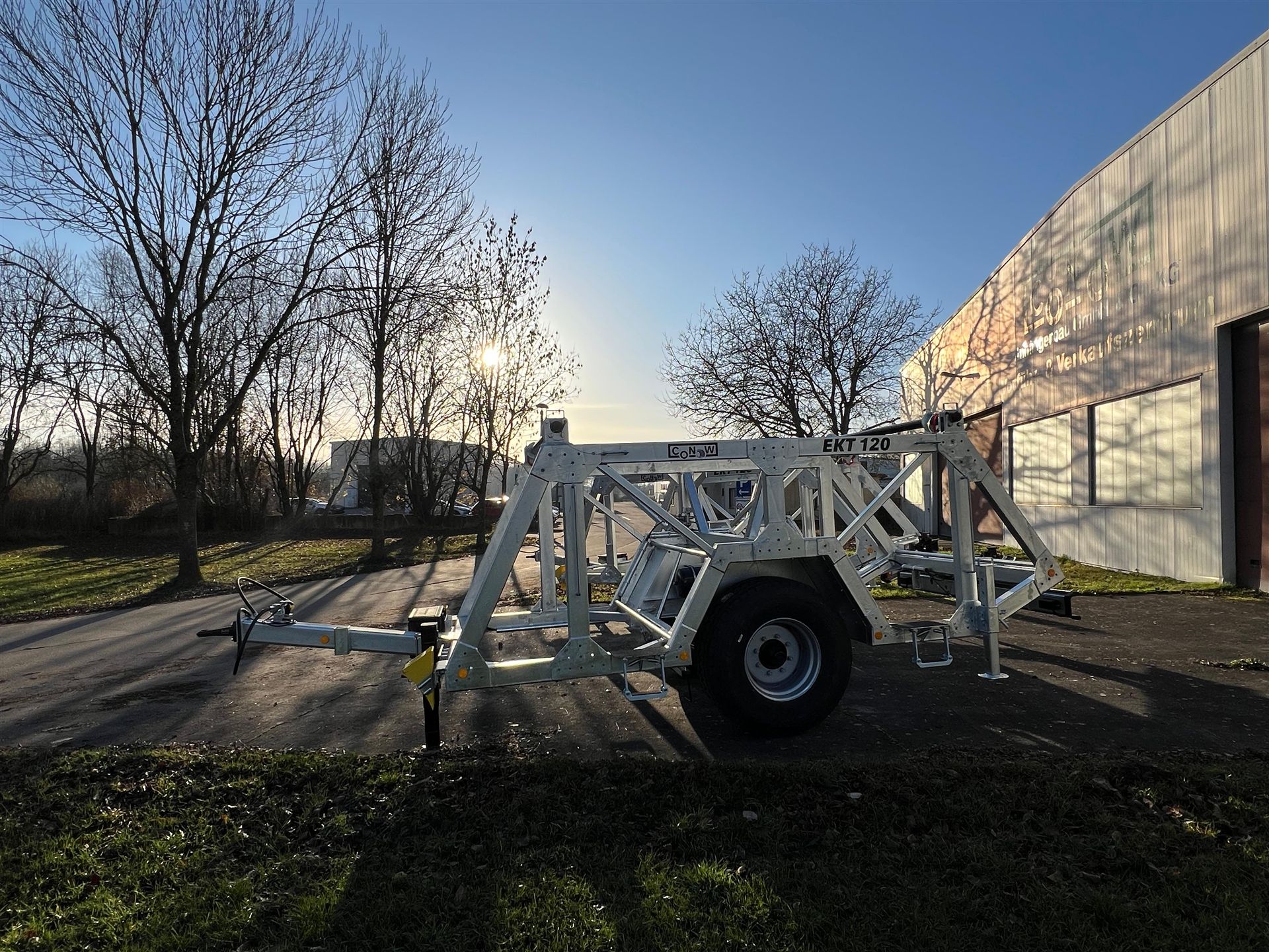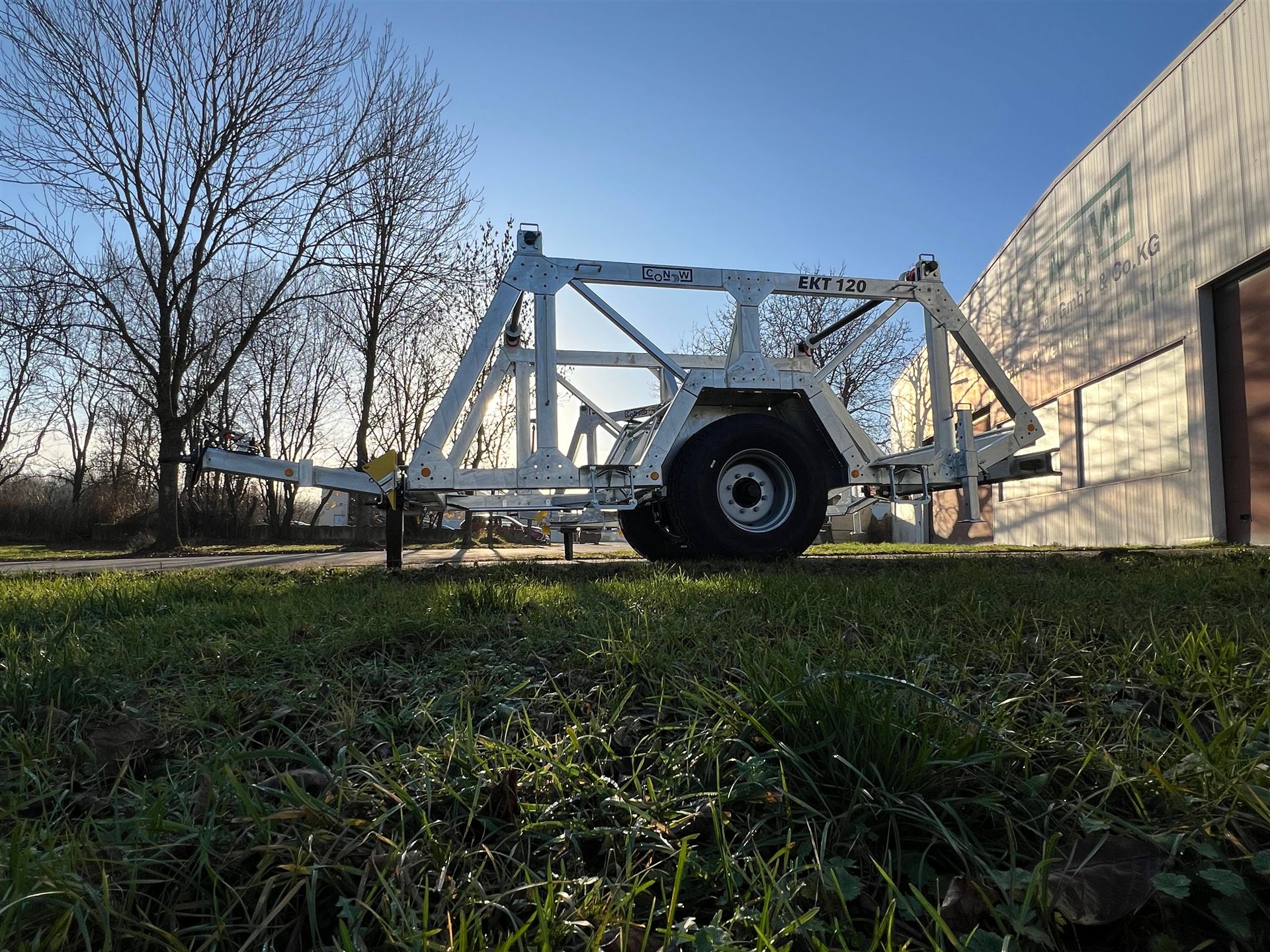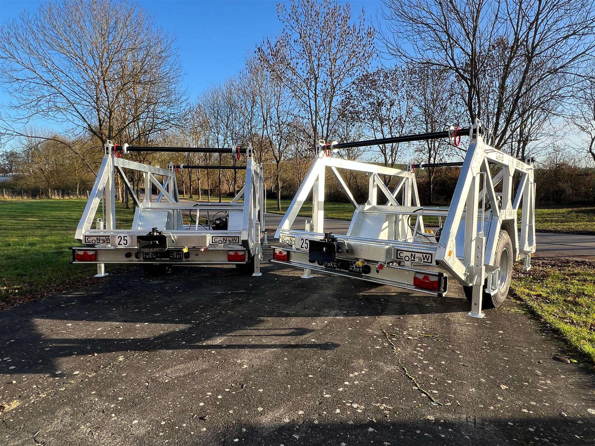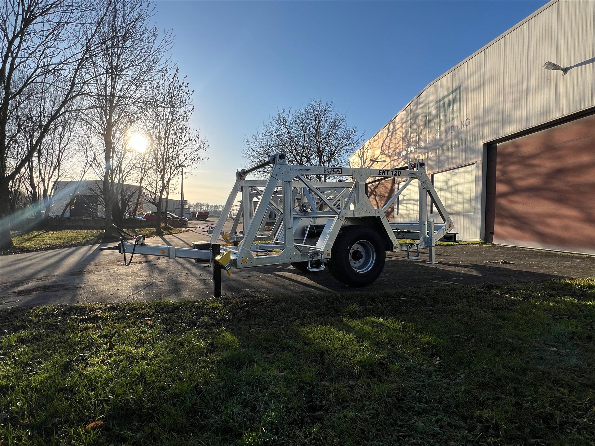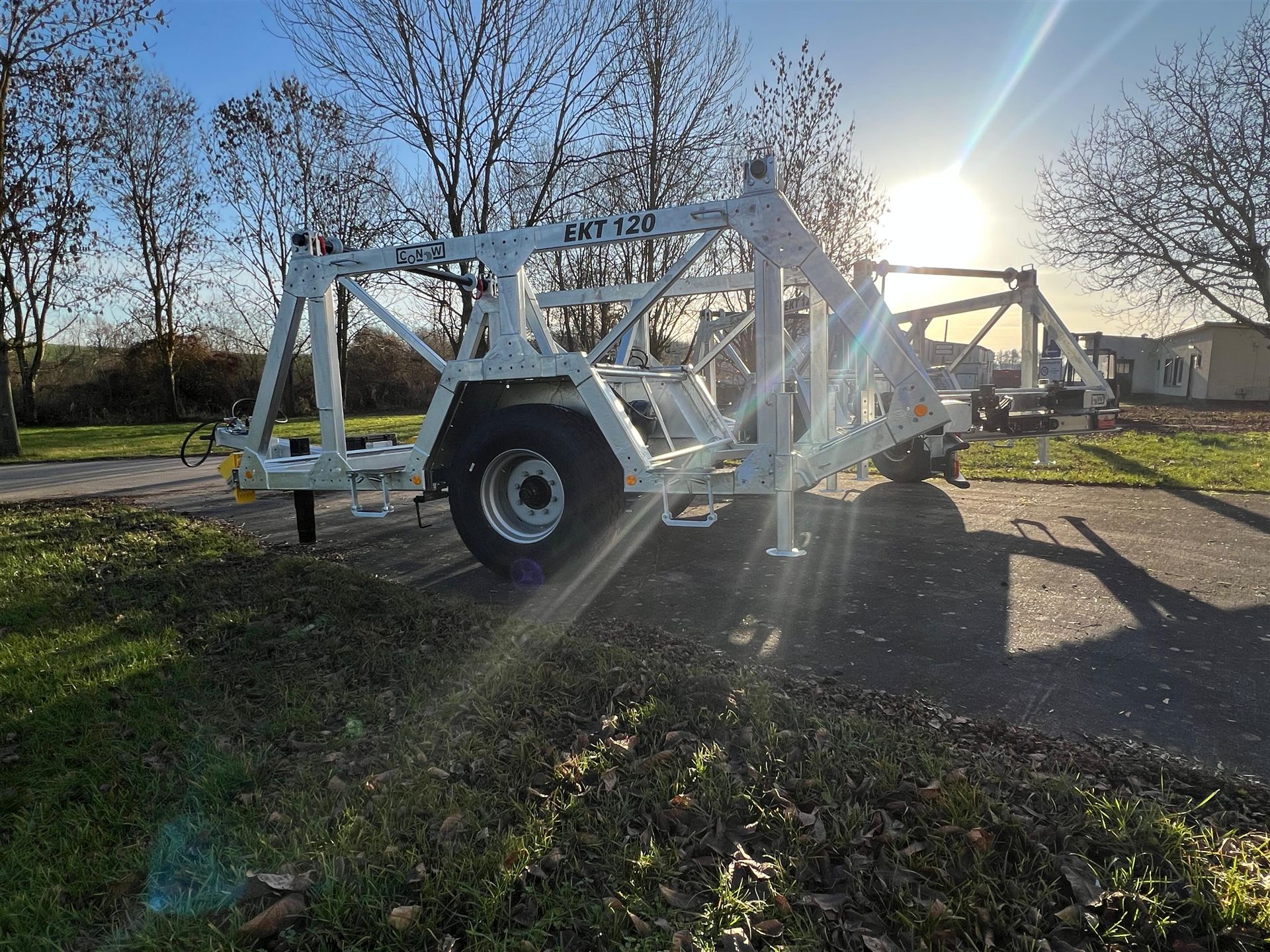Unser neuester Anhänger ist ein Anhänger zum Transport von Kabeltrommeln – hier gebaut als Einachser für zwei Trommeln. Er ist in Zusammenarbeit mit den beiden Unternehmen Dietzel GmbH, Energie- & Elektroanlagenbau und der Leitungsbau Mitte GmbH entstanden. Mit einem zulässigen Gesamtgewicht von 12t ist der hier dargestellte Kabeltrommelanhänger EKT120 für eine Zuladung von 9,8t ausgelegt. Eine Trommelbreite von 1900mm und ein Trommeldurchmesser von 2750mm ermöglichen den Transport großer Kabeltrommeln. Die Kabeltrommelwellen zeichnen sich in ihrer Robustheit aus, sind auf drehbaren Walzen gelagert und sind kranbar um ein Verladen und Abrollen zu vereinfachen. Ebenfalls bieten wir Zubehör, wie beispielsweise Werkzeugkisten oder LED-Arbeitsbeleuchtung, an. Gerne bauen wir Ihn nach Bedarf auch in weiteren Auslegungen, kommen Sie einfach auf uns zu!